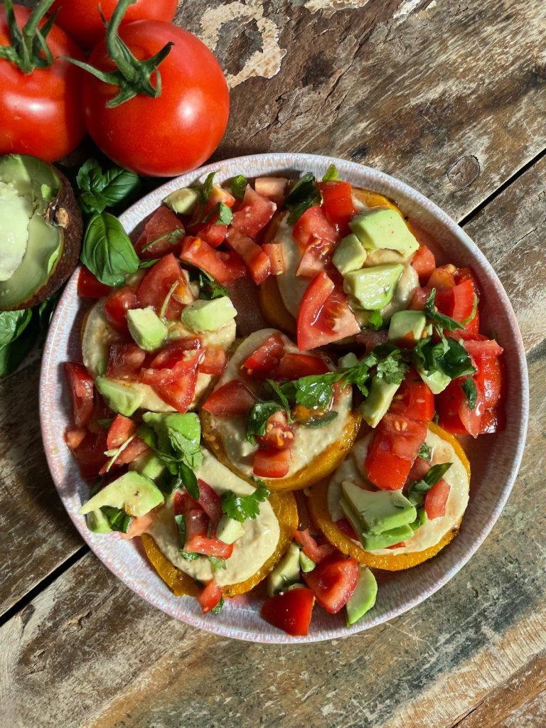 Geroosterde flespompoen met humus en groene zonnesalade