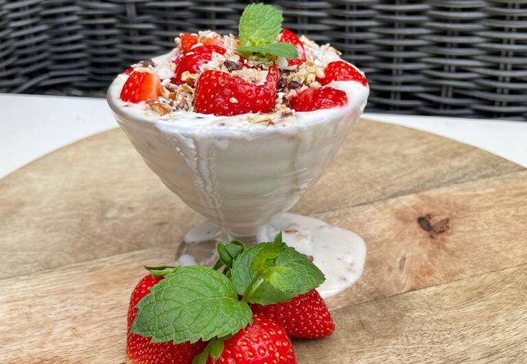 3. Doe ijs in een kommetje strooi de crumble over het ijs en garneer het met stukjes verse aardbeien. ENJOY!