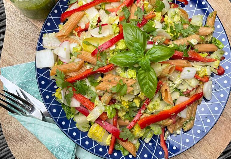 Snij de puntpaprika, witlof, radijsjes en romanasla naar gewenste vorm. Meng alle ingrediënten samen met pesto, zout en peper in een kom goed door elkaar.